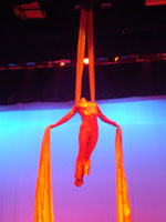 巴西組合表演節(jié)目(一):“綢吊”,它的表現(xiàn)形式,將表演道具“綢吊”在寬度和色彩上加以夸張,并將一般垂直“綢吊”的表演形式改革創(chuàng)新為快速飛旋的高空表演,在編排創(chuàng)意上以人類永恒的“情愛”立意,表現(xiàn)了人類對美好愛情的向往追求。其充滿浪漫情懷的藝術表現(xiàn)就給現(xiàn)場觀眾帶來了強烈的震撼。
