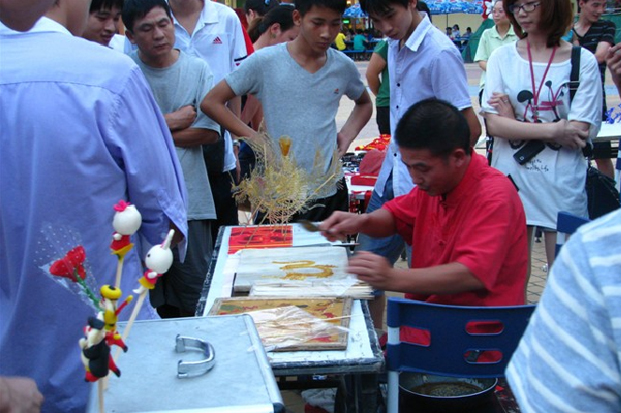 糖畫,又稱“糖影兒”、“糖餅兒”,相傳它是在古代“糖丞相”制作技藝的基礎(chǔ)上演化而來的。據(jù)褚人獲《堅瓠補集》載,明俗新年祀神,要溶就糖霜,印鑄成各種動物和人物作為祭品,因所鑄人物形象儼然文臣武將,又以文官居多,故而時下戲稱為“糖丞相”。后來,四川民間藝人在此基礎(chǔ)上改進工藝,以糖液作墨,凝神運腕,在光潔的大理石板上抖、提、頓、放、收,時快時慢,時高時低,隨著縷縷糖絲飄下,諸如飛禽走獸、花鳥蟲魚、神話人物等形象便栩栩如生地呈現(xiàn)在你的眼前。尤其是那翻云滾霧的金龍和展翅欲飛的彩鳳,更令人拍案叫絕。