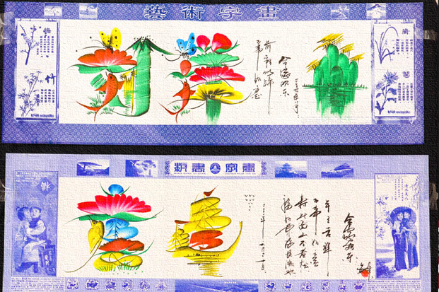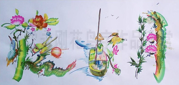 民間花鳥字,又叫龍鳳字、多彩花鳥蟲魚組合書法、藏字畫、字謎語、飛帛板書、意匠文字,又因為常常用于書寫某個人的姓名,故也有叫做名字作畫,等等。它利用特制的多彩畫筆,一氣呵成,能快速繪出簡潔的物形、螺線等代替文字的筆畫,利用字里藏畫的結(jié)構(gòu)形式,巧妙地融字、畫于一體,表達出吉祥喜慶等多種效果,同時又增強文字的意趣及視覺的吸引力。既有傳統(tǒng)國畫的干凈利落,又有西洋畫的鮮艷色彩。飛龍、舞鳳、花草、小鳥、蝴蝶、魚兒相映成趣,令人百看不厭,有書法家難起筆,畫家難潤色之說,是中華民族歷史文化百花園中的一枝奇葩。